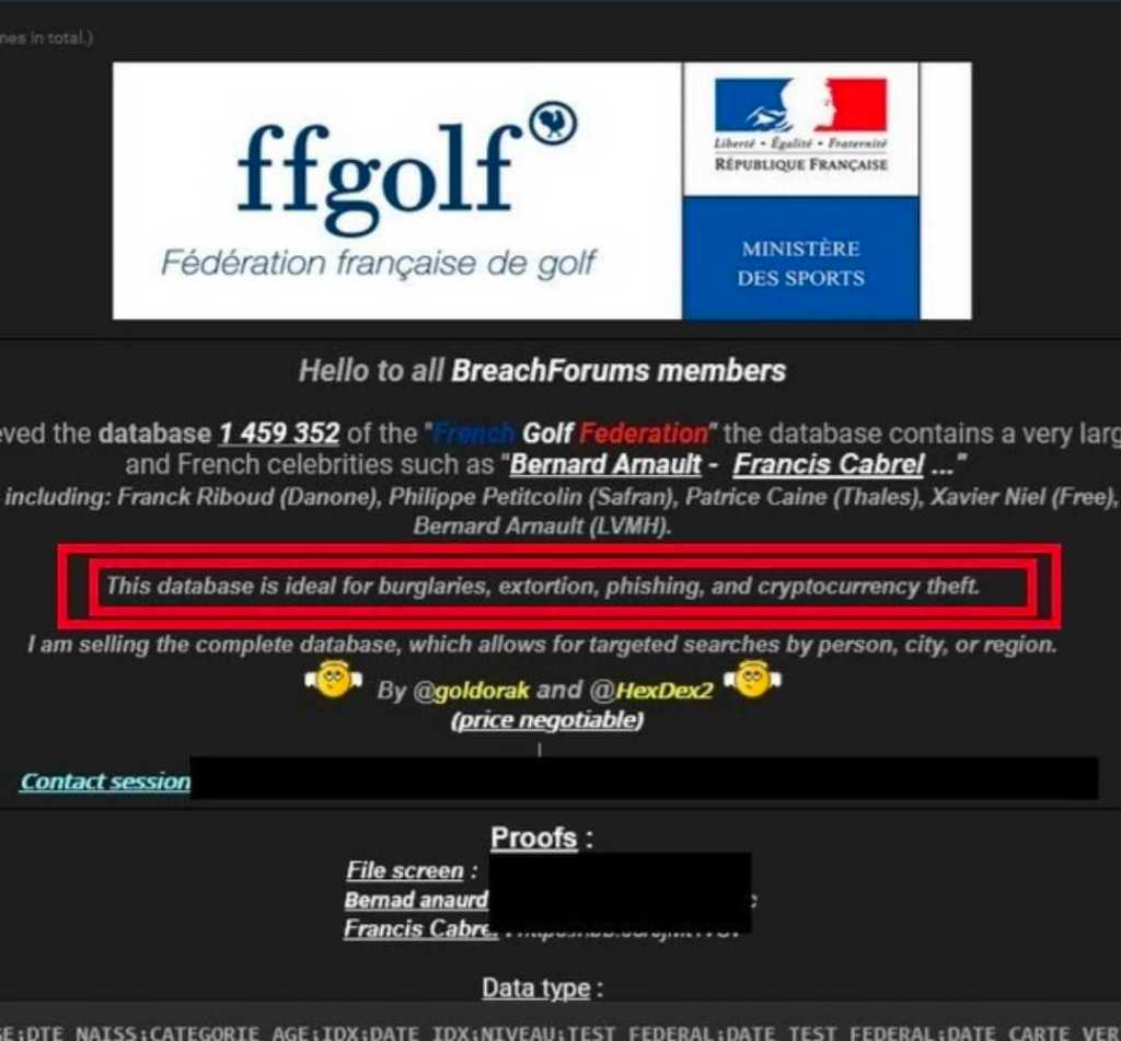 Tireurs et chasseurs ne sont pas les seuls à être visés puisque la Fédération française de golf a aussi été victime d’un piratage hier. Le plus embêtant est que les coordonnées de Nicolas Lerner, directeur de la DGSE, font partie de la fuite. On peut lire sur le message de mise en vente de ces données qu’elles sont « idéales pour cambriolages, extorsion, pishing et vol de cryptomonnaies. »