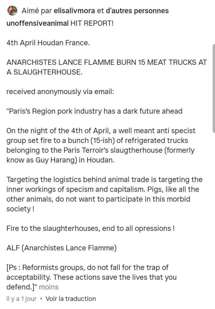 Le 8 avril, soit 4 jours après l’incendie, un compte Instagram antispéciste dénommé unoffensiveanimal, relaie la revendication d’un groupe antispéciste radical qui affirme être à l’origine de l’incendie des véhicules de l’entreprise.