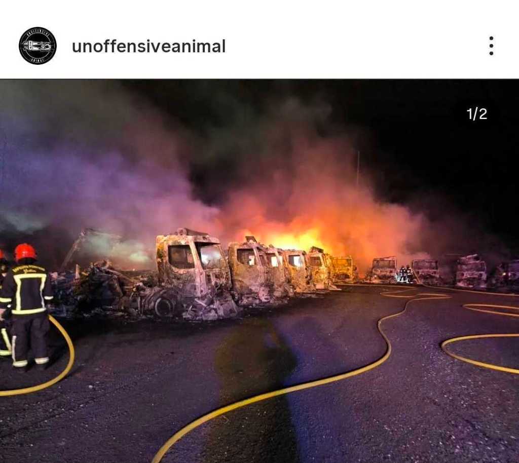 « DES ANARCHISTES INCENDIAIRES BRÛLENT 15 CAMIONS DE VIANDE DEVANT UN ABATTOIR.