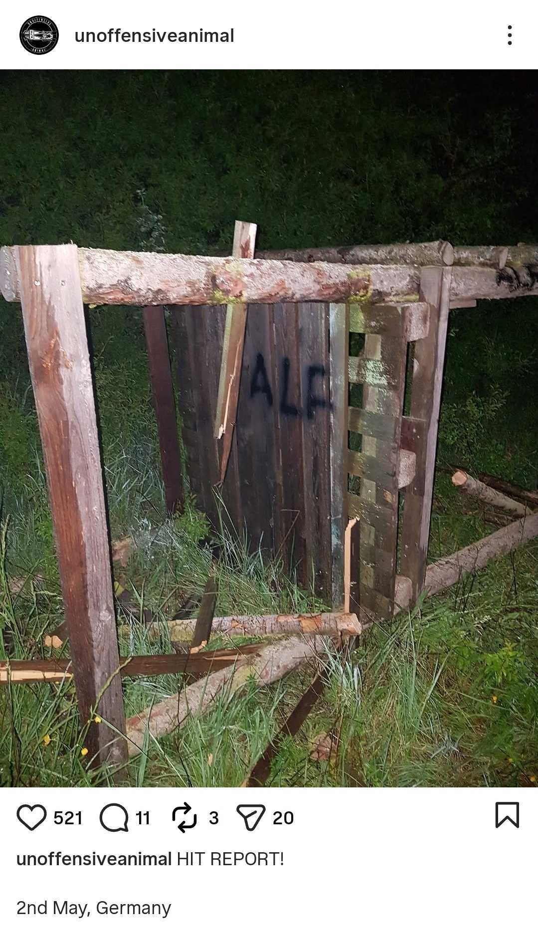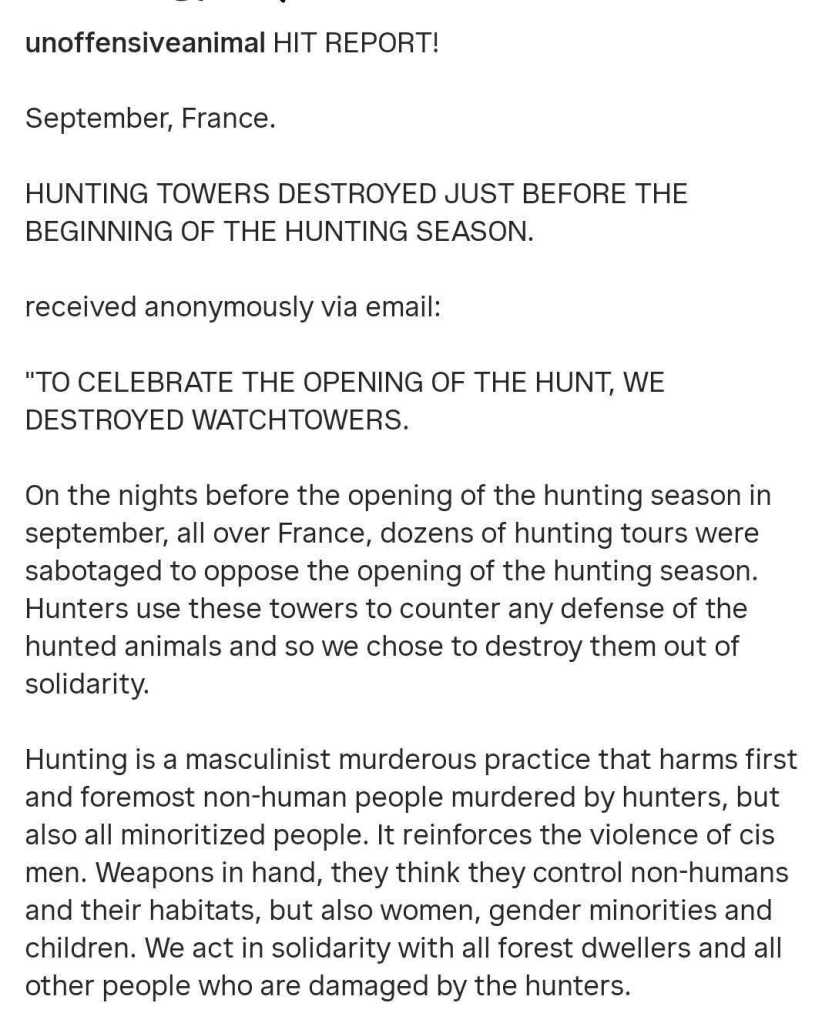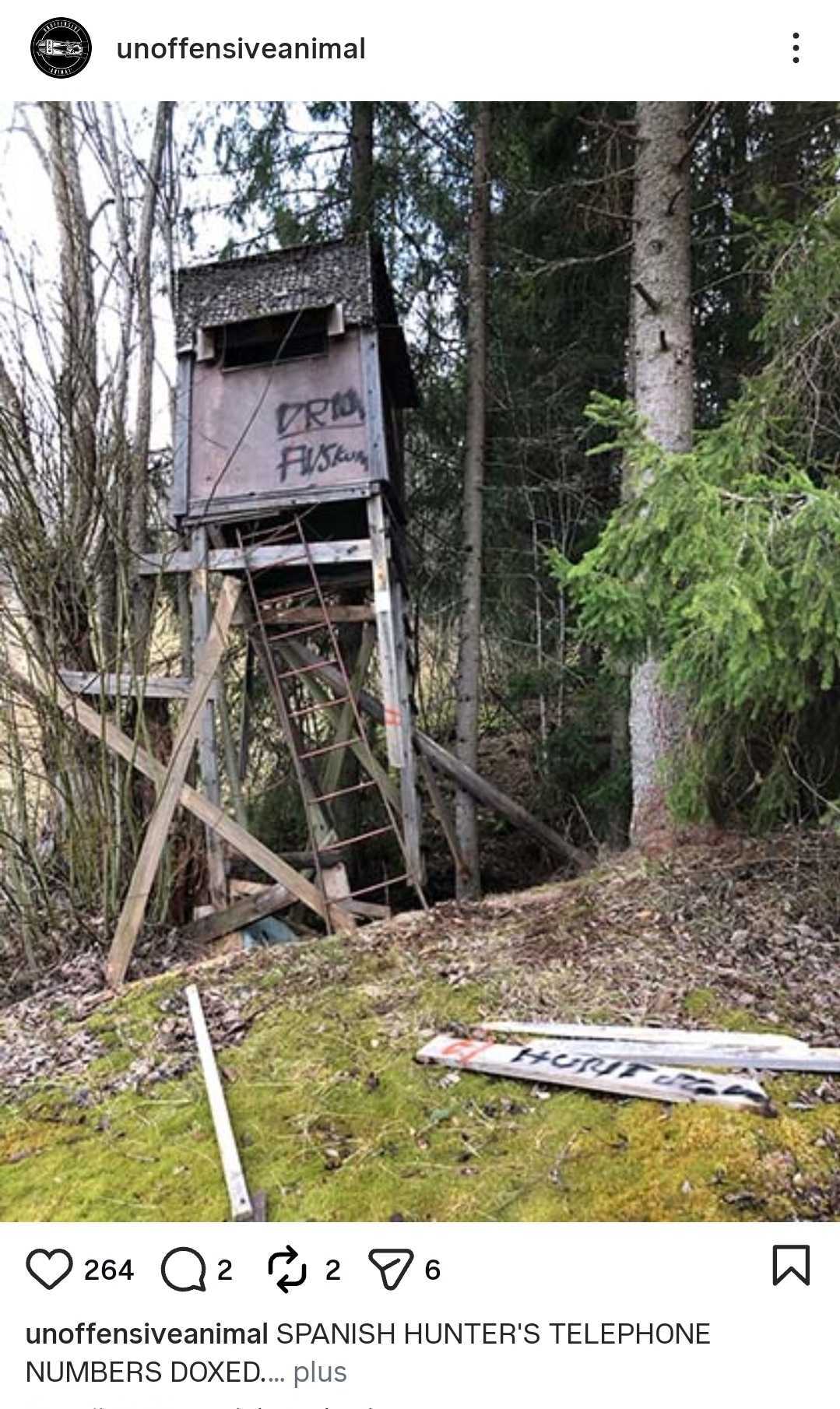 Le compte Unoffensiveanimal promeut aussi la destruction d’infrastructures liées à la chasse, comme le sabotage de miradors ou l’incendie de rendez-vous de chasse que ce soit en France, en Espagne ou ailleurs en Europe.
