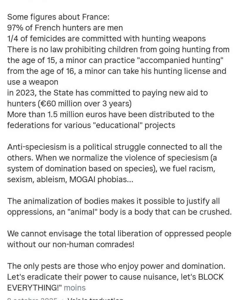 L’antispécisme est une lutte politique liée à toutes les autres. Lorsque nous normalisons la violence du spécisme (un système de domination fondé sur l’espèce), nous alimentons le racisme, le sexisme, le capacitisme, les phobies envers les personnes LGBT…L’animalisation des corps permet de justifier toutes les oppressions ; un corps « animal » est un corps qui peut être écrasé. Nous ne pouvons envisager la libération totale des personnes opprimées sans nos camarades non humains ! Les seuls nuisibles sont ceux qui jouissent du pouvoir et de la domination. Éradiquons leur pouvoir de causer des nuisances, BLOQUONS TOUT ! »