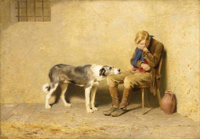Rivière, insuffle au chien des émotions profondément humaines. En effet, le visage du jeune homme étant caché, c’est le chien qui devient le centre de la composition. Son expression est rendue avec tant de tendresse et de compassion qu’elle oriente le spectateur dans son opinion. Nous sommes appelés par l’artiste a moins être scandalisés par le crime du garçon qu’émus par la fidélité de l’animal.