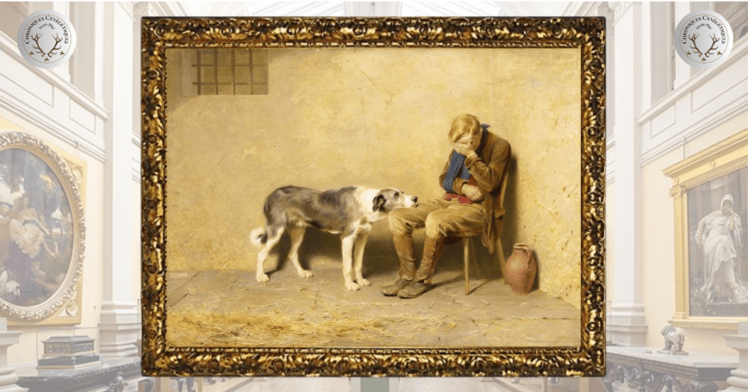 La scène se déroule dans une pièce dépouillée, probablement une cellule, aux murs de pierre pâle et au sol jonché de brins de paille. Un jeune braconnier et son chien fidèle sont enfermés ensemble, dans l’attente du procès. Le garçon, vêtu d’habits rustiques et simples est assis voûté sur une chaise en bois. Son visage est enfoui dans une main, tandis que son autre bras, qui semble blessé est soutenu par une écharpe. Peut-être une blessure lors de son arrestation ? Bien que nous ne puissions pas voir son expression, la posture choisie par le peintre exprime honte, chagrin et désespoir.