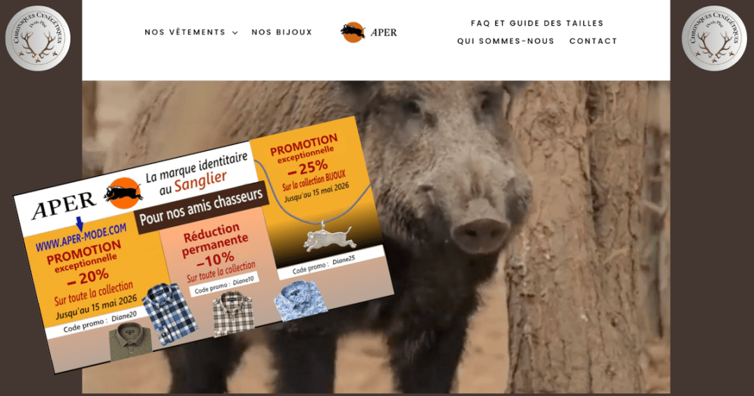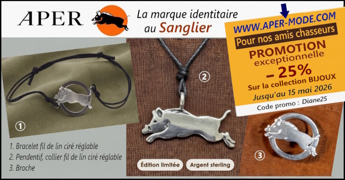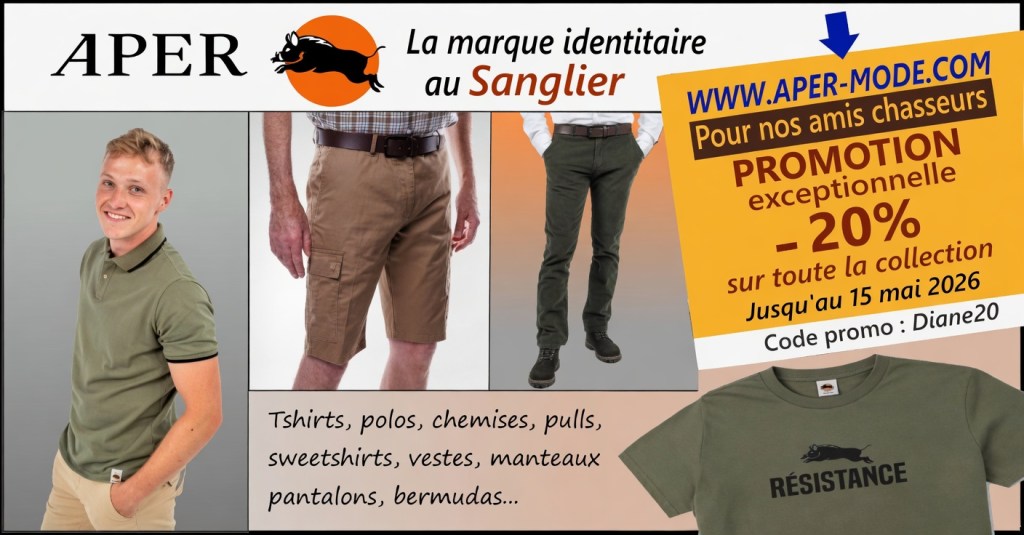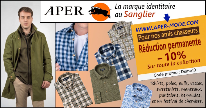 Aper Mode est une firme française qui commercialise des vêtements et des bijoux fabriqués en France et en Europe. Leur logo est un sanglier, animal sacré des gaulois. Ils ont décidé d’offrir des réductions aux chasseurs !